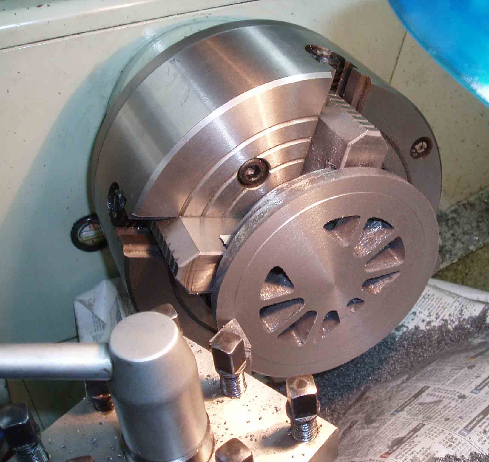 The wheels were turned using a tungsten carbide bit for roughing to remove the "skin" and were finished using a HSS tool. The inside of the wheel was held in a 3 jaw chuck and machined first followed by drilling and reaming, the wheels were then turned around and fitted to a turned mandrel held in the 3 jaw to turn the other side. Newspaper was placed on the lathe bed to catch the abrasive cuttings.