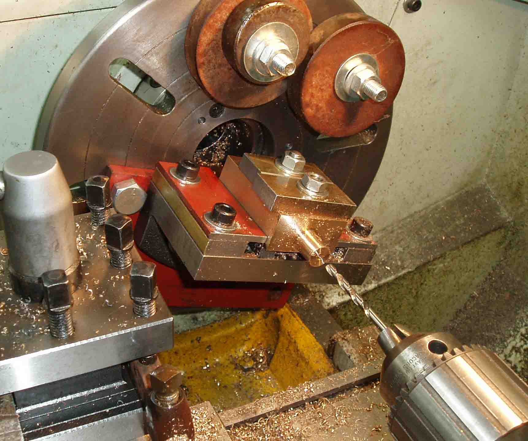 The Steam chests were drilled then bored on an angleplate mounted on the faceplate in the lathe,